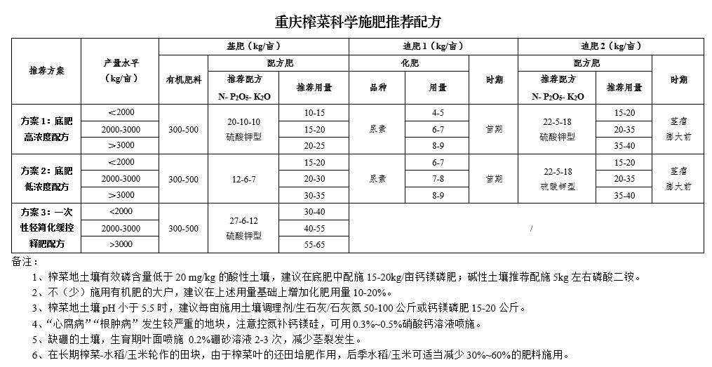基于榨菜需肥规律,结合近年来土壤养分变化趋势及农业生态环境保护需求,项目组明确了榨菜科学施肥养分投入量的确定原则——氮肥总量控制、分期调控,磷钾肥衡量监控;根据当前榨菜种植的产量水平,项目组明确了产量水平分三级推荐的原则;结合榨菜规模化种植和肥料品种升级的发展趋势,项目组明确了在尊重传统肥料品种的基础上增加高浓度配方和新型肥料模式推荐。