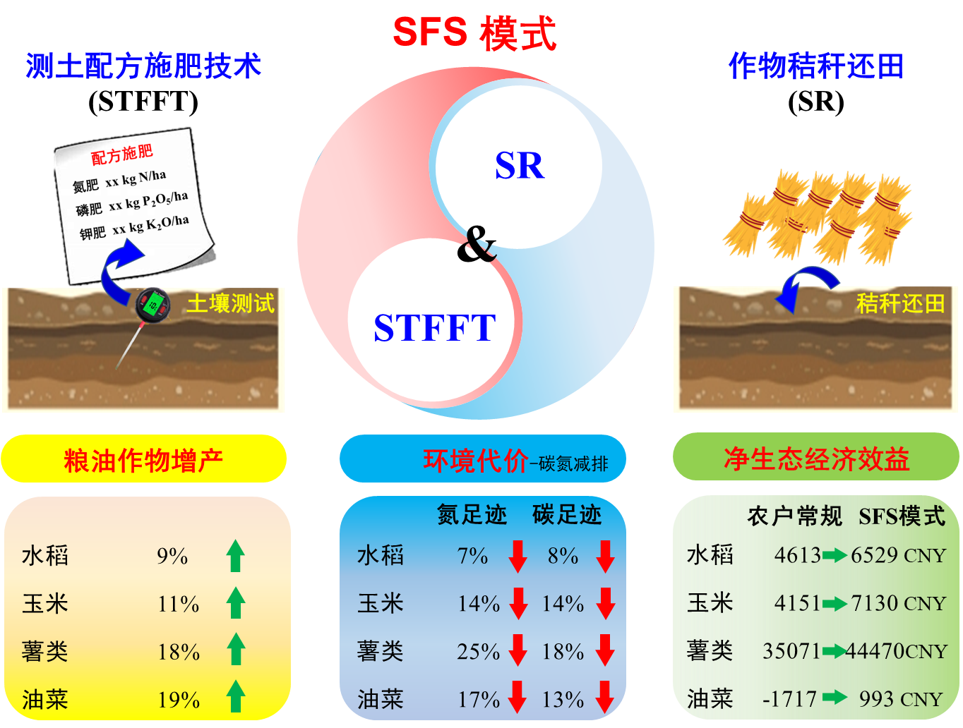 当前研究采用全生命周期评价方法,系统评价了全市2021—2022年开展的覆盖80%全市主要生产区域的128个SFS模式集成技术田间对比试验的成效。结果表明,相较于农民传统耕作方式,SFS模式显著提高了四大粮油作物产量(增幅9%~19%)、降低了生态环境代价(氮、碳足迹降幅各位7%~25%、8%~18%)、提高了净生态系统经济收益。该研究得到我站2021—2022年化肥减量增效关键技术示范推广与效果监测重点项目、市农科院高标准农田建设旱坡地平整土壤地力恢复与提升技术研发等项目的资助。