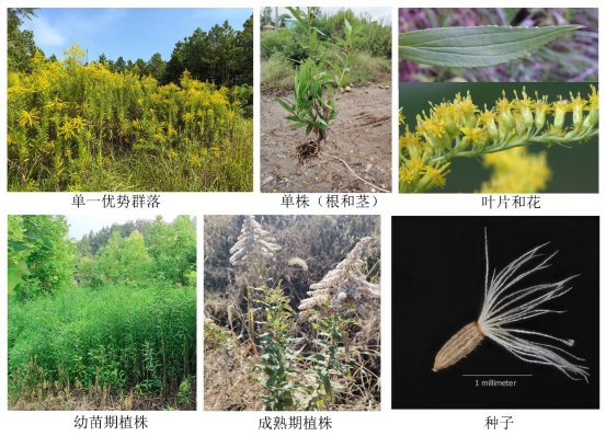 (一)形态与物候特性。加拿大一枝黄花为多年生草本植物,具长根状茎。茎直立,株高0.3—2.5米,上部常被短柔毛或糙毛。叶互生,无柄或下部叶具柄,基生叶与茎下部叶常在花期前枯萎;叶片披针形或线状披针形,长5—15厘米,宽0.5—2.5厘米,边缘具锯齿或波状钝齿,具离基三出脉,两面被糙毛。圆锥花序顶生,分枝呈蝎尾状;瘦果褐色,近圆柱形,长约1毫米,被微柔毛,具7条纵棱,冠毛白色,长3—3.5毫米。花果期为7—11月。在华东地区,11月至次年8月为营养生长期,9—10月进入生殖生长,10月初见花,11月初吐冠毛,果实陆续成熟。