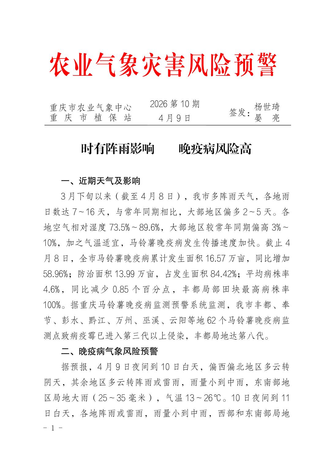 重庆市2026年3月24日农业气象灾害预警(晚疫病)