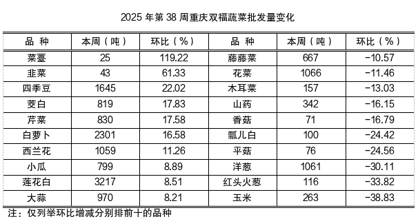 第38周蔬菜批发量表现20减17增5平稳,总批发上市量48223.43吨,环比上浮0.93%、表现平稳,同比滑1.17%、表现平稳。其中,大宗蔬菜批发品种(周批发总量超过700吨)29个,批发量44847.99吨,环比下滑0.39%、表现平稳,同比下滑0.18%、表现平稳,占总批发量的93.39%。大宗品种排名前10的品种:土豆4968吨、番茄3870吨、莲花白3217吨、老姜2348吨、白萝卜2301吨、青椒2219吨、洗葱2157吨、四季豆1645吨、黄瓜1589吨、莴笋1573吨。(增减幅前十位品种见下表)