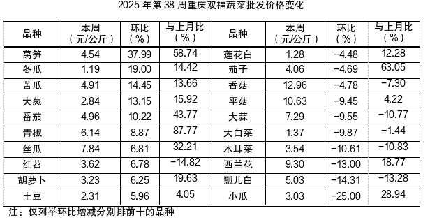 第38周蔬菜批发价格环比22涨16跌4平稳,总体算术批发均价4.84元(为公斤价,以下同),环比下滑0.62%、表现平稳,同比大幅下跌24.38%。总体加权批发均价4.19元,环比上浮0.86%、表现平稳,同比大幅下跌26.40%。具体表现,环比涨幅较大的品种及价格变化:莴笋4.54元,环比陡升37.99%;冬瓜、苦瓜、大葱、番茄,环比分别明显上涨19.00%、14.45%、13.15%、10.22%。环比跌幅较大的品种及价格变化:小瓜3.03元,环比大幅下跌25.00%;瓢儿白、西兰花、木耳菜,环比分别明显下跌14.31%、13.00%、10.61%。(增减幅前十位品种见下表)