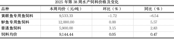 据市农业农村委监测,第38周水产饲料均价9144.44元/吨,环比、同比分别上浮0.05%、0.47%,表现均平稳。其中黄颡鱼专用鱼饲料稳中略跌1.72%,鲈鱼专用鱼饲料持平,普通鱼饲料上涨3.15%。