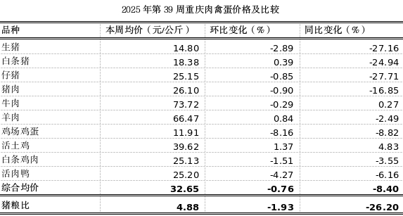 据市农信中心对我市各区县农贸市场10个主要肉禽蛋品种监测,第39周重庆市肉禽蛋均价32.65元,环比平稳,跌0.76%,同比明显下跌8.40%。本周重庆猪肉市场仍然处于低位。传统的“金九”消费旺季并未能扭转跌势,市场呈现出“旺季不旺”的现象。供应端,去年底能繁母猪存栏的高位直接导致了当前生猪供应十分充足。需求端,尽管临近中秋和国庆双节,但下游的备货需求不及预期。贸易商心态谨慎,多以随用随采为主,未能有效拉动猪价上涨。此外,禽肉、牛羊肉等其他肉类价格也处于低位,分流了部分猪肉消费。综合来看,预计短期内重庆猪肉价格仍将在低位震荡运行。虽然双节假期可能会带来短暂的消费提振,但在供应过剩的大背景下,价格反弹的幅度将非常有限。本周白条猪批发价上涨0.39%,生猪收购价、仔猪零售价、猪肉零售价分别下跌2.89%、0.85%、0.90%,猪粮比4.88:1(低于盈亏平衡点6:1),环比稳中略跌1.93%,同比陡降26.20%。