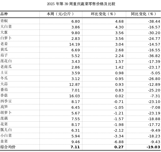 第39周重庆市各区县农贸市场22个蔬菜监测品种零售均价7.11元,环比上浮0.27%,表现平稳;同比明显下跌19.03%。本周零售市场供应持续稳定,品种丰富,价格平稳。其中,青椒、大白菜环比分别上涨4.68%、4.30%;韭菜、小白菜环比分别下跌6.88%、3.34%。其余蔬菜价格波动较小。