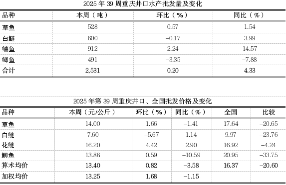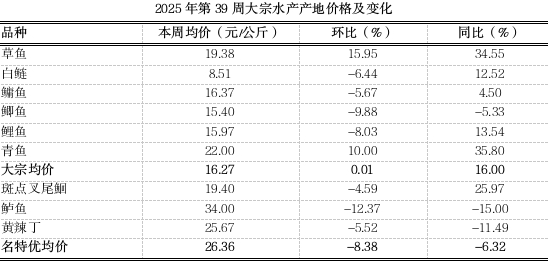 据市农业农村委监测,第39周重庆大宗水产产地均价16.27元,环比上浮0.01%、表现平稳,同比上涨16.00%。随着水产传统销售旺季结束,加之休渔期的结束,海鲜供应量显著增多,大量外地低价海产品进入市场,消费者对传统大宗淡水产品的需求明显下降,大宗水产价格整体向下调整,由于近期临近双节假期,备货需求上升,尤其是大规格草鱼,餐饮消费量较大,流通收购量增加,向上波动幅度显著,但市场供应较为充足,整体平稳运行,价格波动仍在可控范围内。名特优水产均价26.36元,环比下跌8.38%,同比下跌6.32%。
