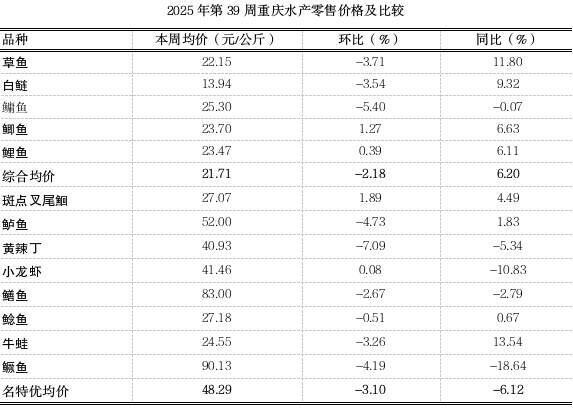 据市农业农村委监测,第39周重庆大宗水产零售均价21.71元,环比小幅下跌2.18%,同比上涨6.20%,名特优水产均价48.29元,环比下跌3.10%,同比下跌6.12%。临近双节,零售端为吸引流量,促销活动增多,价格短期小幅向下浮动。