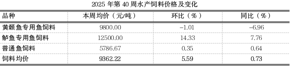据市农业农村委监测,第40周水产饲料均价9362.22元/吨,环比上涨5.59%,同比上浮0.73%,表现平稳。其中黄颡鱼专用鱼饲料稳中略跌1.01%,鲈鱼专用鱼饲料上涨14.33%,普通鱼饲料平稳。