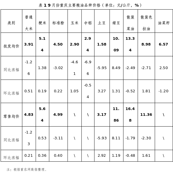 9月,学校陆续开学,叠加国庆、中秋节日效应,市内内粮油市场储备充足、购销两旺,各品种价格稳中有涨。监测的六类[包括稻米、玉米、小麦、土豆、食用植物油、杂粮六大类。]十种单品批发价环比5稳4涨1跌,粮油综合均价环比涨0.68%,涨幅较上月提高1.12个百分点,同比涨0.33%。