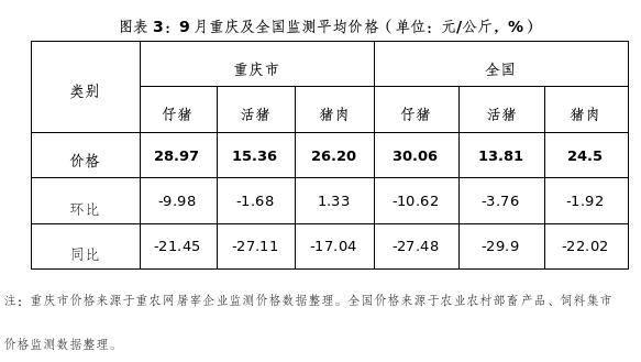 9月我市仔猪价格同全国走势相同,均下跌。我市仔猪均价28.97元/公斤,环比跌9.98%,同比跌21.45%(见图表3)。9月设计年出栏500头及以上规模场生猪头均亏损8元。
