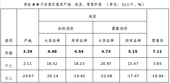 据重庆市38个区县农贸市场22个蔬菜品种监测,9月重庆蔬菜零售均价7.11元/公斤,环比上涨5.65%,同比跌16.84%。