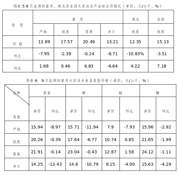 9月监测的大宗淡水产品各类型价格环比均不同程度下跌,同比除井口市场批发价外,其余类型价格均不同程度上涨。重庆井口市场大宗淡水产品批发综合均价13.21元/公斤,较湖北均价高6.96%,比全国均价低12.69%。9月份大宗淡水鱼捕捞上市量大幅增加,市场供应充足,主产区湖北综合批发价环比下跌超10%,导致大宗水产品各类型价格环比不同程度下跌,同比除重庆井口市场批发价下跌外,其余类型价格不同程度上涨。