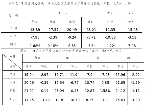 9月监测的大宗淡水产品各类型价格环比均不同程度下跌,同比除井口市场批发价外,其余类型价格均不同程度上涨。重庆井口市场大宗淡水产品批发综合均价13.21元/公斤,较湖北均价高6.96%,比全国均价低12.69%。9月份大宗淡水鱼捕捞上市量大幅增加,市场供应充足,主产区湖北综合批发价环比下跌超10%,导致大宗水产品各类型价格环比不同程度下跌,同比除重庆井口市场批发价下跌外,其余类型价格不同程度上涨。