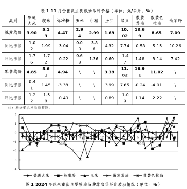 11月,市内粮油市场储备充足,各品种价格稳中有涨。监测的六类十种单品3稳3涨4跌,粮油综合均价环比跌0.60%,跌幅较上月缩小0.7个百分点,同比涨0.46%。。
