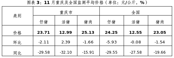 11月我市仔猪价格同全国走势相同,均下跌。我市仔猪均价23.71元/公斤,环比跌2.11%,同比跌29.58%(见图表3)。11月设计年出栏500头及以上规模场生猪头均亏损138元,比上月头均少亏损32元。