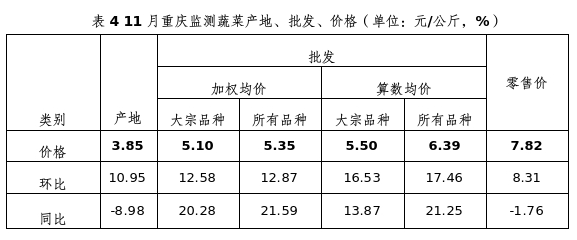 据重庆市38个区县农贸市场22个蔬菜品种监测,11月重庆蔬菜零售均价7.82元/公斤,环比上涨8.31%,同比下滑1.76%、表现平稳。