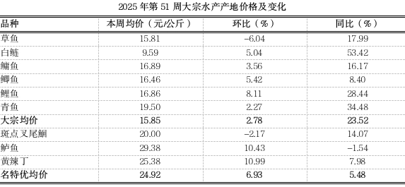 据市农业农村委监测,第51周重庆大宗水产产地均价15.85元/公斤,环比小幅上涨2.78%,同比上涨23.52%。名特优水产均价24.92元/公斤,环比上涨6.93%,同比上涨5.48%。前期为水产传统消费淡季,批发渠道采购大部分为刚需,大宗水产价格主要以跌为主。近期受“双旦”节日推动,流通速度加快,部分品种小幅波动,但水产养殖迎来“年末收官期”,叠加资金回笼、塘租缴纳等多重因素影响,或迎来集中出鱼高峰,难以支撑价格回升,涨幅较为有限。