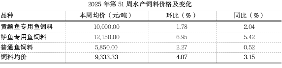 据市农业农村委监测,第51周水产饲料均价9333.33元/吨,环比、同比分别上涨4.07%、3.15%。其中黄颡鱼专用鱼饲料稳中略涨1.78%,鲈鱼专用鱼饲料上涨6.95%,普通鱼饲料小幅上涨2.27%。