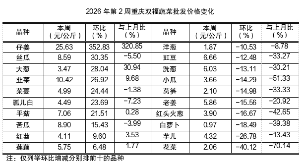 第2周蔬菜批发价格环比24跌15涨3平稳,总体算术批发均价6.16元(为公斤价,以下同),环比上涨8.26%,同比上浮0.16%、表现平稳。总体加权批发均价4.99元,环比略跌3.89%,同比上涨8.89%。具体表现,环比跌幅较大的品种及价格变化:花菜2.06元,环比骤降40.12%;芋儿4.32元,环比大幅下跌26.78%;白萝卜、红头火葱、老姜、莴笋、小瓜、洗葱、豇豆、洋葱,环比分别明显下跌18.49%、16.67%、15.56%、14.98%、14.29%、13.11%、12.48%、10.53%。环比涨幅较大的品种及价格变化:仔姜25.63元、丝瓜8.59元,环比分别陡升352.83%、30.35%;大葱3.47元、韭菜10.42元、菜薹4.99元、瓢儿白4.49元、平菇7.06元,环比分别大幅上涨28.04%、26.92%、24.44%、23.69%、21.51%;苦瓜,环比明显上涨15.43%。(增减幅前十位品种见下表)