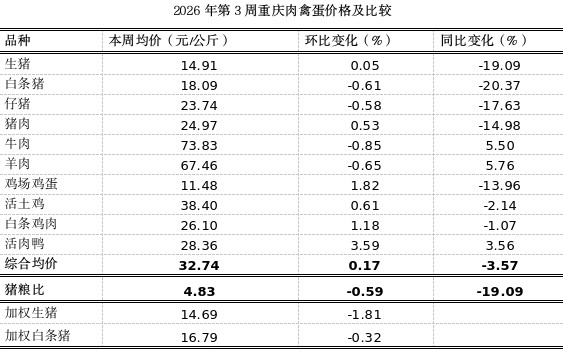 据市农信中心对我市各区县农贸市场10个主要肉禽蛋品种监测,第3周重庆市肉禽蛋均价32.74元,环比平稳,涨0.17%,同比下跌3.57%。本周重庆猪肉市场呈现供应端小幅调整、需求端持续走弱、价格整体以稳为主、局部小幅波动的态势。受元旦后消费回落、腌腊需求进入收尾阶段、北方猪价上涨传导有限等因素影响,重庆猪肉价格未出现大幅波动,与西南地区整体走势基本一致。供应端,规模养殖企业保持稳定的出栏节奏,散户养殖前期压栏的大猪仍在逐步消化,适重猪存栏量依然较高,潜在供应充足。需求端,元旦假期结束后,家庭集中采购需求明显回落,日常鲜销市场交易清淡,腌腊灌肠活动已进入收尾阶段,对猪肉的集中需求大幅减弱,餐饮消费方面冬季餐饮淡季特征明显。预计1月下旬,随着腌腊需求完全结束,猪肉价格可能小幅承压。本周生猪收购价、猪肉零售价分别上涨0.05%、0.53%,白条猪批发价、仔猪零售价分别下跌0.61%、0.58%,猪粮比4.83:1(低于盈亏平衡点6:1),环比下跌0.59%,同比大幅下跌19.09%。