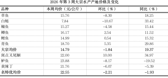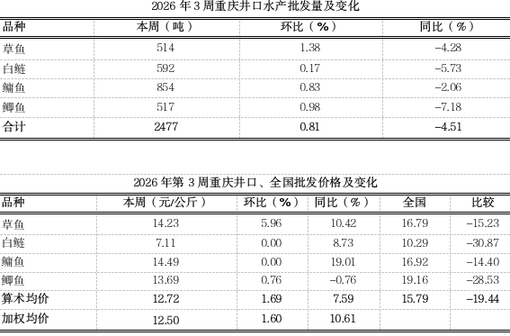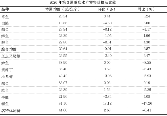 据市农业农村委监测,第3周重庆大宗水产产地均价14.79元,环比稳中略跌1.84%,同比上涨19.37%。名特优水产均价22.55元,环比小幅下跌2.21%,同比稳中略跌1.93%。年后市场消费热度回落,家庭采购与餐饮需求同步收缩,市场流通节奏明显放缓,加之年前处于集中出鱼高峰,存塘量持续消耗,年后存塘收紧,随着气温逐渐降低,近期外地鱼流入增加,本地水产价格整体向下波动。