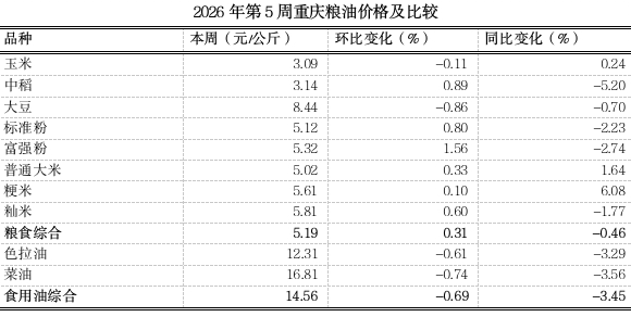 根据市农信中心对我市各区县农贸市场10个主要粮油品种监测,第5周(2026.1.26~2026.2.1)重庆粮食均价5.19元、食用油均价14.56元(公斤价,以下同),环比分别上浮0.31%、下滑0.69%,均表现平稳,同比分别下跌0.46%、3.45%。总体来看,国内粮油生产供应稳固,供给总体宽松。随着春节临近,市场消费需求逐渐回升,市内粮油市场各品种价格将以稳为主。分品种看1涨9平稳。其中富强粉零售价略涨1.56%。其余粮油品种延续平稳态势。