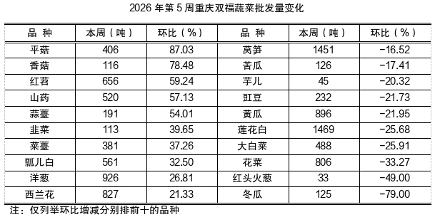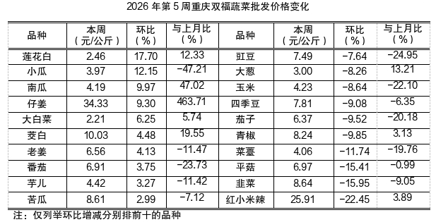第5周蔬菜批发价格环比21跌15涨5平稳,总体算术批发均价6.44元(为公斤价,以下同),环比略跌3.59%,同比下滑1.38%、表现平稳。总体加权批发均价5.71元,环比下滑1.71%、表现平稳,同比小幅上涨4.64%。具体表现,环比跌幅较大的品种及价格变化:红小米辣25.91元,环比大幅下跌22.45%;韭菜、平菇、菜薹,环比分别明显下跌15.95%、15.41%、11.74%。环比涨幅较大的品种及价格变化:莲花白、小瓜,环比分别明显上涨17.70%、12.15%。(增减幅前十位品种见下表)