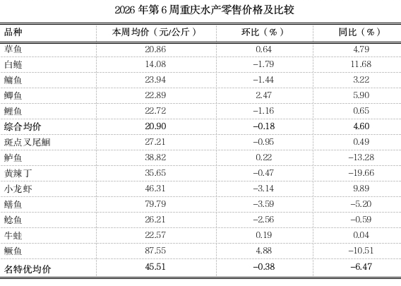据市农业农村委监测,第6周重庆大宗水产零售均价20.90元/公斤,环比下滑0.18%、表现平稳,同比上涨4.60%。名特优水产均价45.51元/公斤,环比下滑0.38%、表现平稳,同比下跌6.47%。