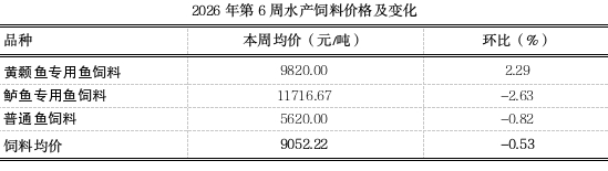 据市农业农村委监测,第6周水产饲料均价9052.22元/吨,环比下滑0.53%、表现平稳,其中黄颡鱼专用鱼饲料小幅上涨2.29%,鲈鱼专用鱼饲料小幅下跌2.63%,普通鱼饲料平稳。