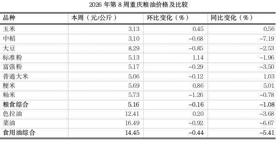 根据市农信中心对我市各区县农贸市场10个主要粮油价格监测,第8周(2026.2.16~2026.2.22)重庆粮食均价5.16元、食用油均价14.45元(公斤价,以下同),环比分别下滑0.16%、0.44%,均表现平稳,同比分别下跌1.08%、5.41%。总体来看,国内粮油生产供应稳固,供给总体宽松,春节期间市场消费需求回升,市内粮油市场各品种价格以稳为主。分品种看1涨1跌8平稳。其中,标准粉零售价略涨1.14%,籼米零售价略跌1.26%。其余粮油品种延续平稳态势。