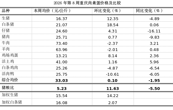 据市农信中心对我市各区县农贸市场10个主要肉禽蛋品种监测,第8周重庆市肉禽蛋均价33.03元,环比平稳,涨0.10%,同比稳中略跌1.95%。本周重庆猪肉市场呈现节前微涨收尾,节后快速转弱的态势。供应端,产能充足,出栏集中。春节前集团猪场为冲业绩提前出栏,节后继续“降重走量”,加剧供应压力。需求端,节前腌腊需求受健康饮食影响同比下滑,春节期间家庭消费增量有限。节后消费进入全年低谷,务工人员未返城、学校未开学,餐饮与集团消费尚未启动,需求恢复周期较长。预计短期内猪肉价格跌势放缓,低位震荡。本周生猪收购价、白条猪批发价、仔猪零售价、猪肉零售价分别上涨12.35%、18.54%、4.31%、0.77%,猪粮比5.23:1(低于盈亏平衡点6:1),环比大幅上涨11.63%,同比明显下跌5.50%。