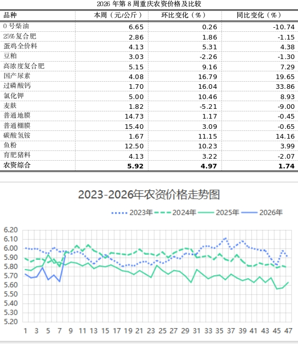 根据市农信中心对全市各区县农贸市场15种主要农资监测,第8周我市农资总体均价5.92元,环比上涨4.97%,同比略涨1.74%。春节期间经营户减少,农资价格上涨明显。春节后重庆气温突降,中心城区12-20度。谨防大风及温度突变对农业生产的影响。本周化肥价格全线上涨,其中高浓度复合肥、国产尿素、过磷酸钙、氯化钾、碳酸氢铵均上涨10%左右,25%复合肥价格略涨1.86%。当前重庆地区处于冬春交替时节,气温缓慢回升但冷空气仍频繁活动,昼夜温差大,蔬菜需重点防范低温冻害、棚内高湿和幼苗徒长三大风险。此时既是大棚茄果类、瓜类蔬菜育苗的关键期,也是露地春播蔬菜的筹备期,应重点抓好稳温保苗,强化育苗、春播准备和病虫防控关键环节。普通地膜、普通棚膜价格分别上涨1.17%、3.09%。饲料价格总体略涨,其中鱼粉上涨10.23%、育肥猪饲料上涨3.22%;豆粕、麦麸分别下跌2.26%、5.21%。注意猪舍引进新猪群时,应天黑时进行,在猪群身后喷撒酒或低浓度的来苏儿,再进行合群。蛋鸡全价料上涨5.31%。0号柴油价格上浮0.26%,价格连续三周上行。