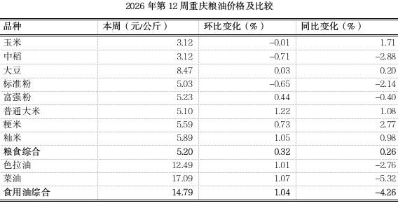 根据市农信中心对我市各区县农贸市场10个主要粮油品种监测,第12周(2026.3.16~2026.3.22)重庆粮食均价5.20元、食用油均价14.79元(公斤价,以下同),环比分别略涨0.32%、1.04%,同比分别上浮0.26%、下跌4.26%。总体来看,各地扎实推进春耕春管,为全年粮食丰收丰产打下基础,市内粮油市场各品种价格将延续以稳为主。分品种看4涨6平稳。其中普通大米、籼米、色拉油、菜油零售价分别略涨1.22%、1.05%、1.01%、1.07%。其余粮油品种延续平稳态势。