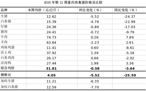 据市农信中心对我市各区县农贸市场10个主要肉禽蛋品种监测,第12周重庆市肉禽蛋均价31.81元,环比平稳,跌0.58%,同比下跌3.64%。本周重庆猪肉市场呈供强需弱、低位运行态势,市场整体偏弱运行。供应端,前期生猪产能集中释放,规模养殖场加快出栏,外地低价猪源持续涌入冲击本地市场,屠宰端货源充足、压价意愿较强,供应端压力居高不下。需求端,春节后消费淡季延续,家庭腌腊库存尚未完全消化,餐饮、团膳等批量采购偏弱,终端走货乏力,需求端支撑不足。短期内猪肉价格仍将低位震荡磨底,继续大幅下跌空间有限。预计3月下旬至4月初,随着清明节日备货启动,终端需求有望小幅回暖,叠加政策收储托底效应显现,预计猪肉价格逐步企稳,呈现窄幅波动、小幅回升态势。本周生猪收购价、白条猪批发价、仔猪零售价、猪肉零售价分别下跌5.52%、4.76%、0.86%、0.72%,猪粮比4.05:1(低于盈亏平衡点6:1),环比下跌5.52%,同比陡降25.59%。