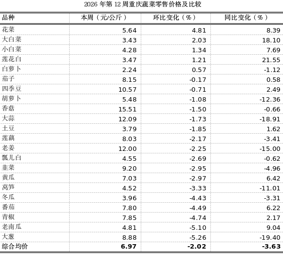 第12周重庆市各区县农贸市场22个蔬菜监测品种零售均价6.97元,环比略跌2.02%,同比略跌3.63%。分品类看2涨11跌9平稳。其中,大葱、老南瓜环比分别下跌5.26%、5.10%;花菜环比上涨4.81%。其余蔬菜价格波动较小。
