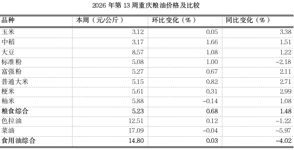 根据市农信中心对我市各区县农贸市场10个主要粮油品种监测,第13周(2026.3.23~2026.3.29)重庆粮食均价5.23元、食用油均价14.80元(公斤价,以下同),环比分别上浮0.68%、0.03%,表现平稳;同比分别略涨1.48%、下跌4.02%。总体来看,各地扎实推进春耕春管,为全年粮食丰收丰产打下基础,市内粮油市场各品种价格将延续以稳为主。分品种看3涨7平稳。其中,中稻、大豆、标准粉零售价分别略涨1.66%、1.08%、1.00%。其余粮油品种延续平稳态势。