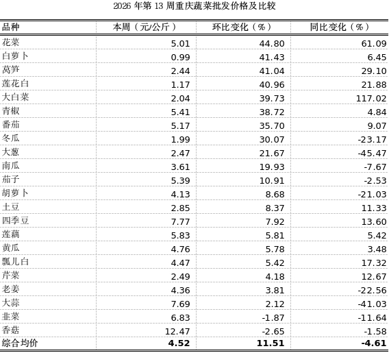 第13周重庆市双福国际农贸城蔬菜批发上市量(去粤菜)4.65万吨,环比略增2.68%;同比上浮1.82%、表现平稳。22个蔬菜监测品种批发均价4.52元,环比明显上涨11.51%,20涨2平稳;同比小幅下跌4.61%。本周南方地区多暴雨天气,影响蔬菜生产运输,批发价格呈上涨态势。其中,花菜、白萝卜、莴笋、莲花白环比分别大幅上涨44.80%、41.43%、41.04%、40.96%,大白菜、青椒、番茄、冬瓜环比分别明显上涨39.73%、38.72%、35.70%、30.07%,大葱、南瓜环比分别上涨21.67%、19.93%。其余蔬菜价格波动幅度较小。