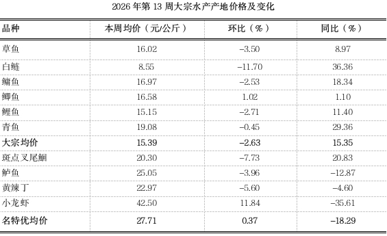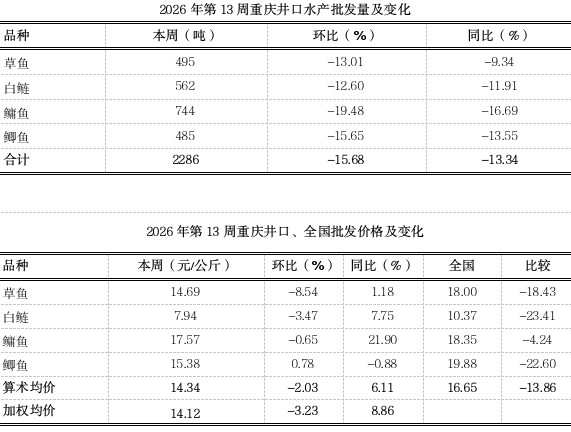 据市农业农村委监测,第13周重庆大宗水产产地均价15.39元,环比小幅下跌2.63%,同比上涨15.35%。名特优水产均价27.71元,环比上浮0.37%、表现平稳,同比下跌18.29%。进入早春时节,淡水鱼市场迎来越冬恢复与春繁准备的关键阶段,加之气温逐渐回升,鱼病发生率高,出鱼节奏受到影响,供应略微波动,近期消费需求无明显提升,市场价格整体小幅下行。小龙虾处于上市初期,消费热度较高,市场行情较好,持续处于上涨趋势。