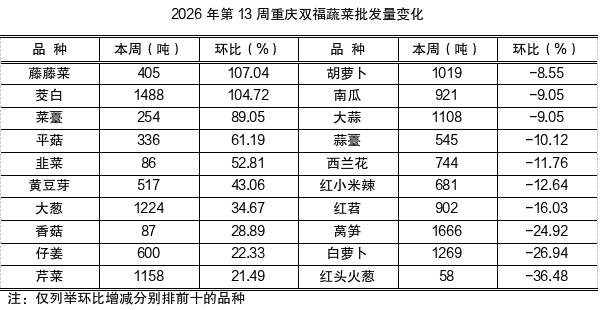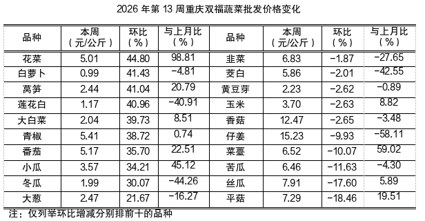 第13周蔬菜批发价格环比29涨11跌1平稳,总体算术批发均价5.46元(为公斤价,以下同),环比小幅上涨5.41%,同比略涨3.61%。总体加权批发均价4.57元,环比明显上涨15.56%,同比略涨3.33%。具体表现,环比涨幅较大的品种及价格变化:花菜5.01元、白萝卜0.99元、莴笋2.44元、莲花白1.17元、大白菜2.04元、青椒5.41元、番茄5.17元、小瓜3.57元、冬瓜1.99元,环比分别陡升44.80%、41.43%、41.04%、40.96%、39.73%、38.72%、35.70%、34.21%、30.07%;大葱2.47元,环比大幅上涨21.67%;南瓜、豇豆、西兰花、茄子,环比分别明显上涨19.93%、14.57%、14.34%、10.91%。环比跌幅较大的品种及价格变化:平菇、丝瓜、藤藤菜、苦瓜、菜薹,环比分别明显下跌18.46%、17.60%、14.90%、11.63%、10.07%。(增减幅前十位品种见下表)