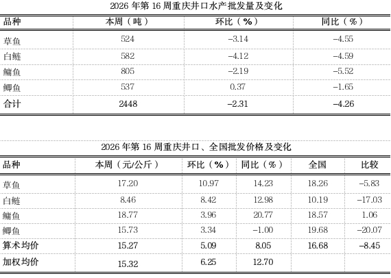 据市农业农村委监测显示:第16周重庆大宗水产产地均价为15.61元,环比上涨3.31%,同比下跌3.63%;名特优水产均价为26.86元,环比下跌3.53%,同比下跌23.38%。市场价格整体呈现上涨态势。