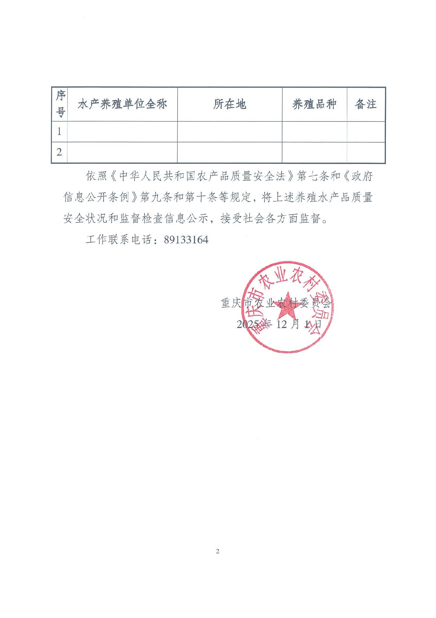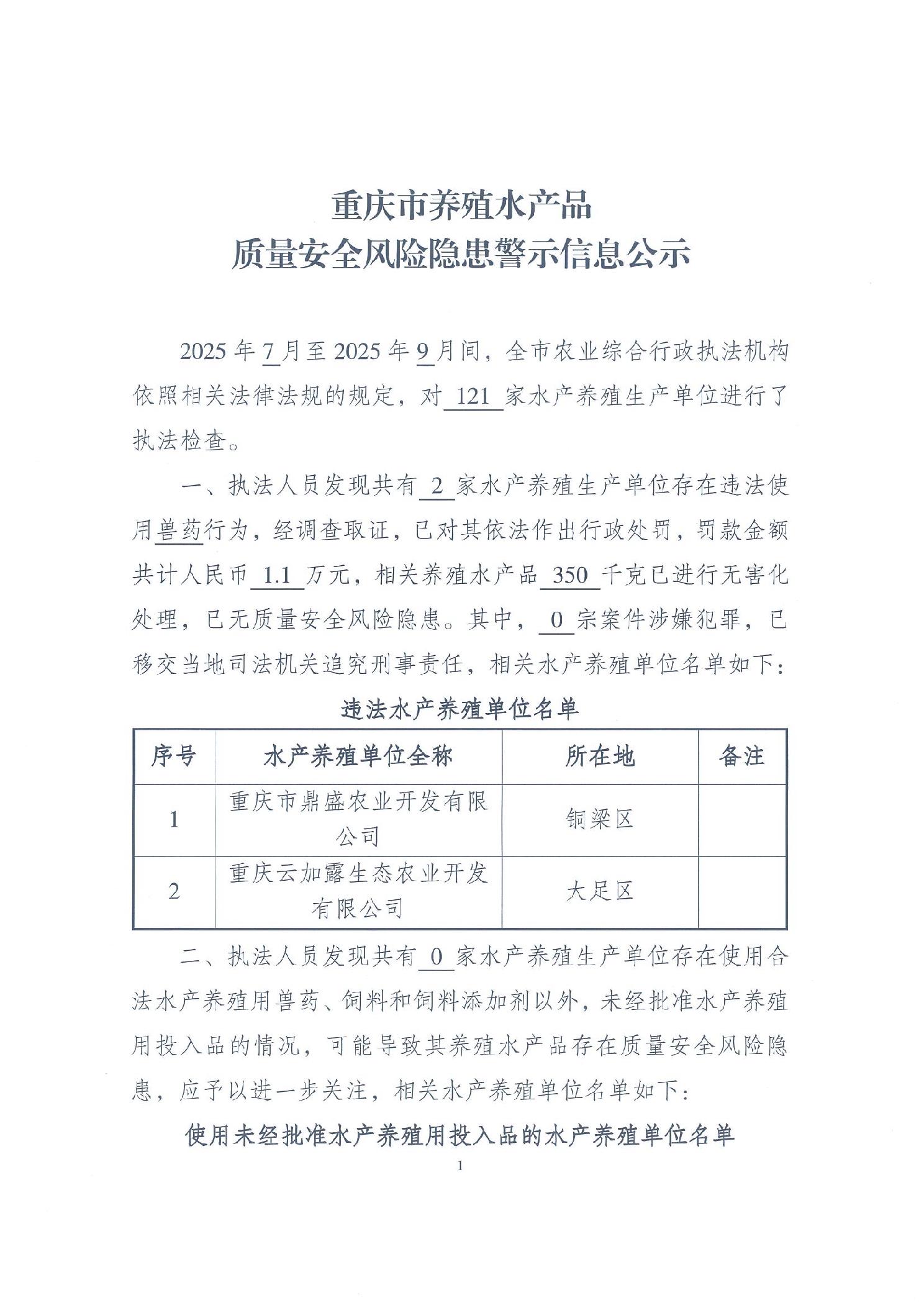 重庆市养殖水产品质量安全风险隐患警示信息公示(2025年第三季度)