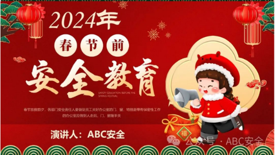 为加强节前“办公区安全、居家安全、出行安全、烟花燃放安全”宣传警示教育,我们收集到2024春节前安全教育资料与大家分享。