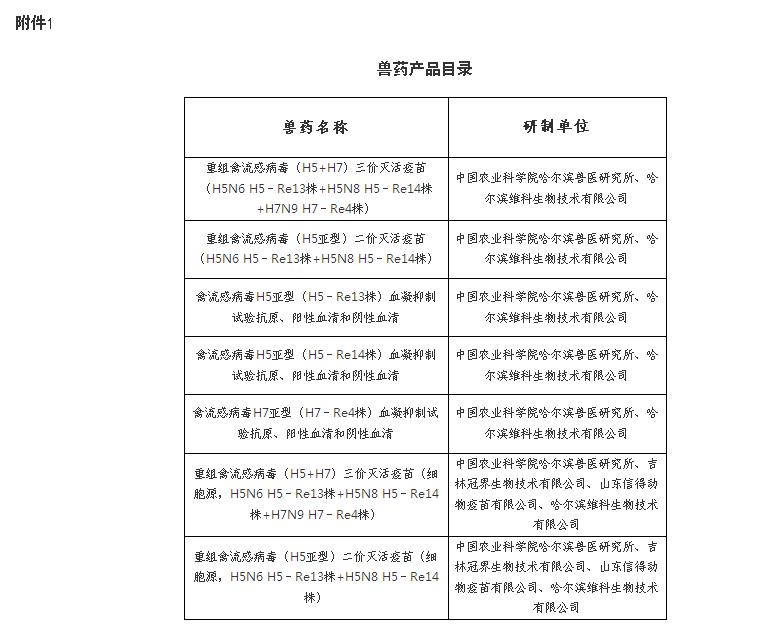 根据《兽药管理条例》和《兽药注册办法》规定,我部组织制定了重组禽流感病毒(H5+H7)三价灭活疫苗(H5N6 H5–Re13株+H5N8 H5–Re14株+H7N9 H7–Re4株)等7种兽药产品工艺规程、质量标准、说明书和内包装标签,现予发布,自发布之日起执行。