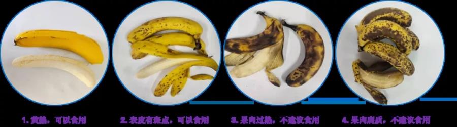 实际上,表皮带有黑斑是代表香蕉已经成熟。未成熟的香蕉中含有大量鞣酸,食用口感生涩,且易导致便秘,成熟后鞣酸含量大大降低,口感香甜。如图1-1中所示,当香蕉表皮黄熟呈光泽,但尚未出现明显斑点且果指端已变黑时,轻按压果身,果肉柔软富有弹性、果肉略粉,此时已可以鲜食,吃起来香气较淡,甜度稍低,略有微涩;如图1-2中所示,当表皮出现明显斑点,表明香蕉已成熟,成熟后果肉均呈淡黄色,味甜而香气较浓郁,吃起来香甜不涩,此时正是鲜食的最佳时间,但必须尽快食用,不宜继续存放;如图1-3和图1-4中所示,随着香蕉表皮的黑斑扩大,果肉逐渐变软甚至已局部出现腐变,表明香蕉存放时间过久,果肉已过度成熟,严重时还会散发异味,则不建议食用。