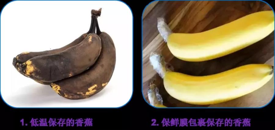 当我们购买香蕉后如不是马上食用时,建议不要将其放于冰箱中冷藏,因为香蕉贮存温度为12℃-16℃,冰箱存放果蔬的温度约为4℃,低温容易导致香蕉表皮出现黑斑,如下图2-1所示。如果想延长香蕉的保存时间,可用保鲜膜将香蕉的根茎部包裹住,将其存放于室温阴凉处,如下图2-2所示。因为香蕉释放的大部分乙烯气体来源于香蕉的根茎部,裹住后就阻碍乙烯的释放,也能延缓香蕉成熟过程;也可以在切开的香蕉根茎部位抹点柠檬汁或者食醋,弱酸处理可以抑制香蕉果皮多酚氧化酶活性,进而抑制香蕉因衰老导致的果皮褐变,有利香蕉的保存;也不要将香蕉与成熟的苹果、橘子等的水果一起存放,成熟的水果也会释放乙烯气体催熟香蕉。