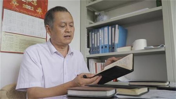 今年58岁的中峰镇板桥村党总支书记、主任何明勇已任村干部18年。每次走村串户时,他都会随身携带着一个笔记本。这些年,他已经记下了好几十个笔记本。