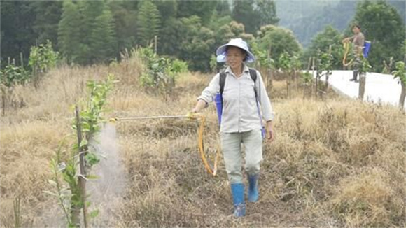 村民在果园里为果树喷洒农药。谢天骄 摄