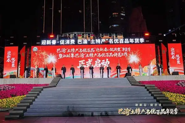 人民网重庆2月2日电 (记者冯文彦)深耕乡村振兴,厚植助农情怀。2月1日晚,由重庆市农业农村委员会、中共重庆市委宣传部、中共重庆市委网络安全和信息化委员会办公室、重庆市商务委员会、重庆市文化和旅游发展委员会及重庆市两江新区人民政府共同主办的巴渝“土特产”名优百品迎新春·促消费年货季,在两江新区观音桥步行街正式启幕。