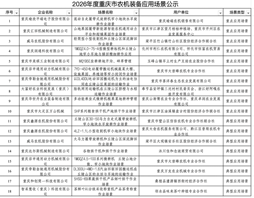 第1眼TV-华龙网讯(记者 梁浩楠)4月15日,重庆市经济信息委公示了2026年度重庆市农机装备应用场景,拟确定入选18个农机装备应用场景,包括10个重点场景和8个典型场景,公示时间于4月21日截止。