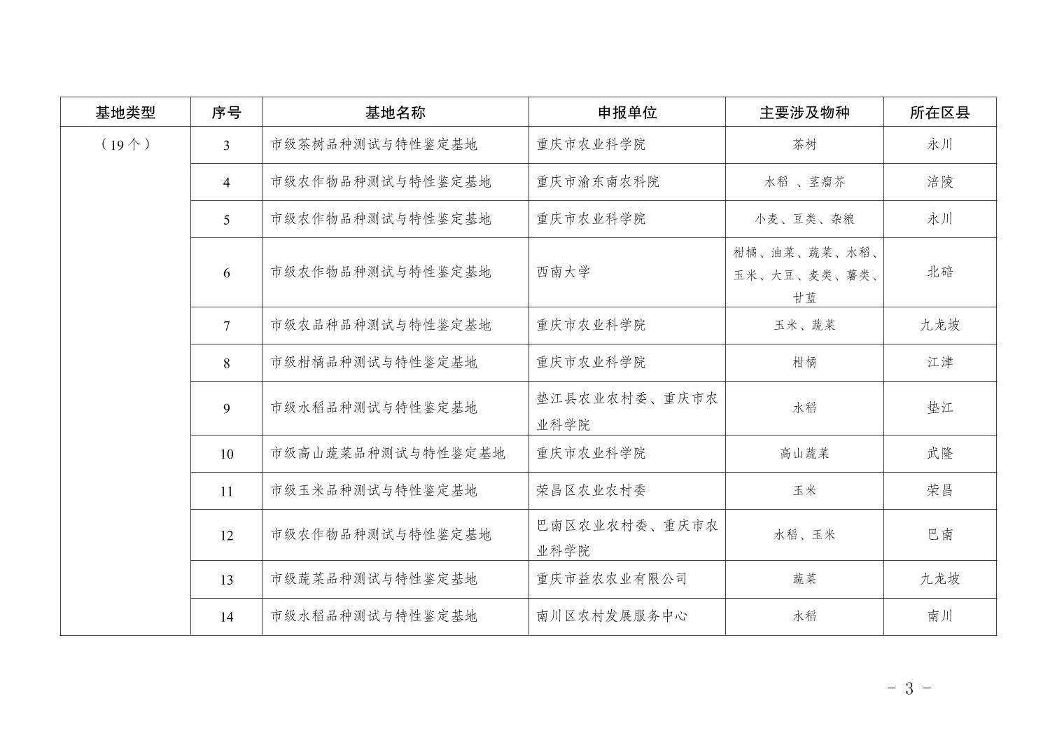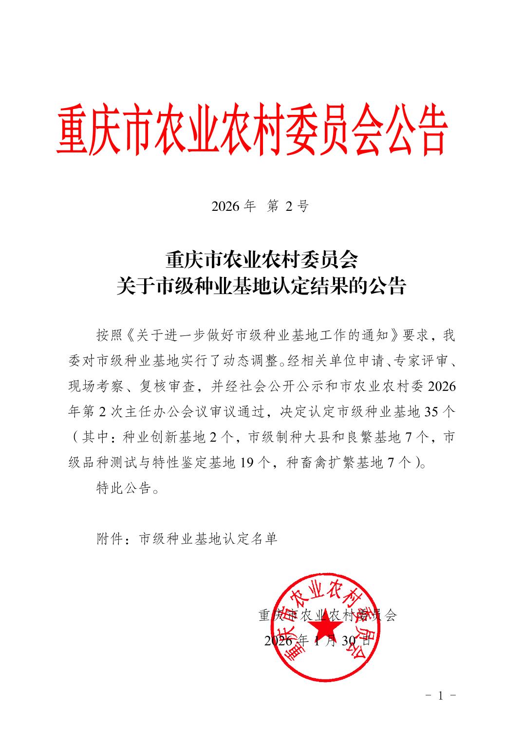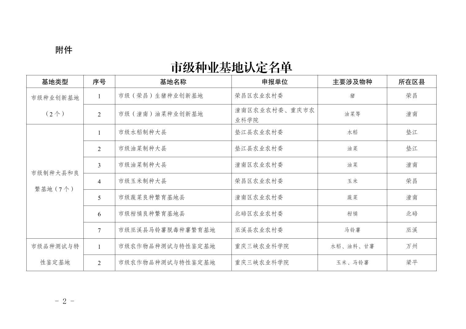 重庆市农业农村委员会关于市级种业基地认定结果的公告
